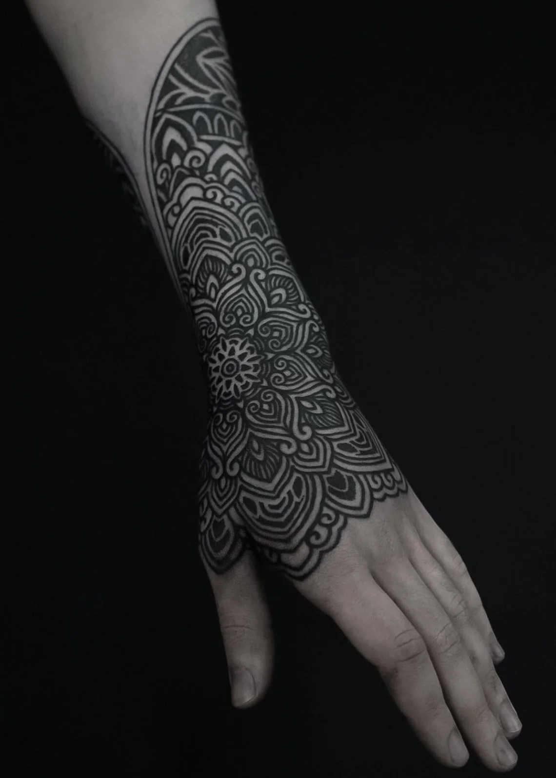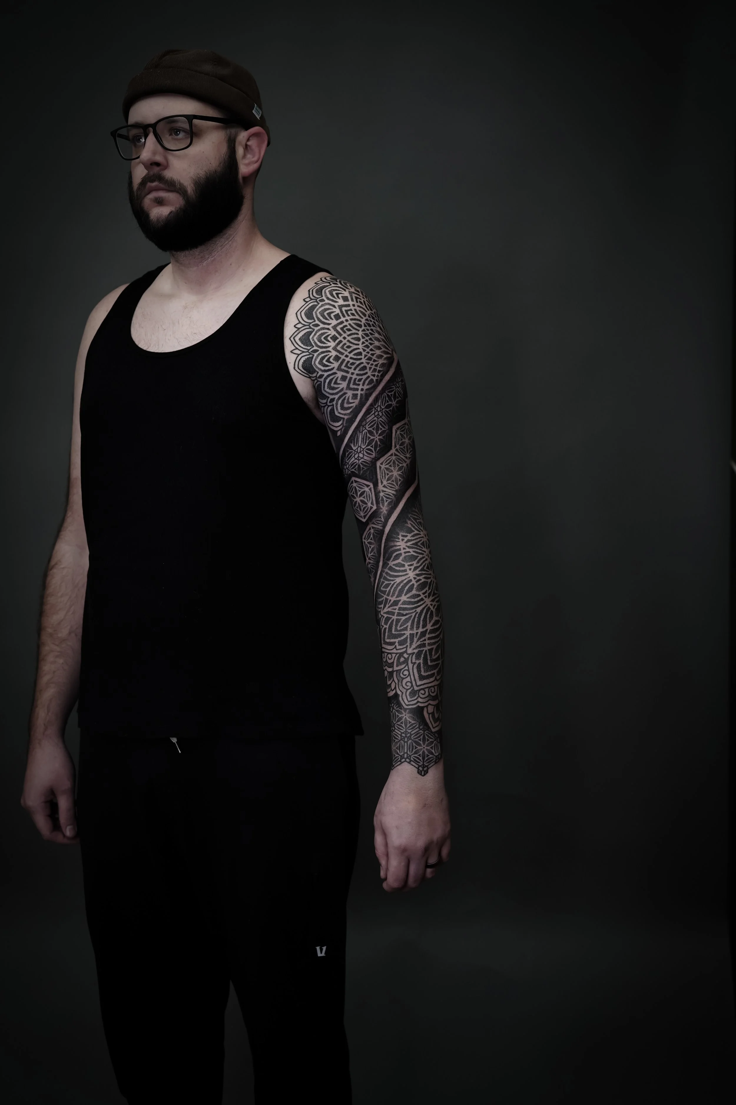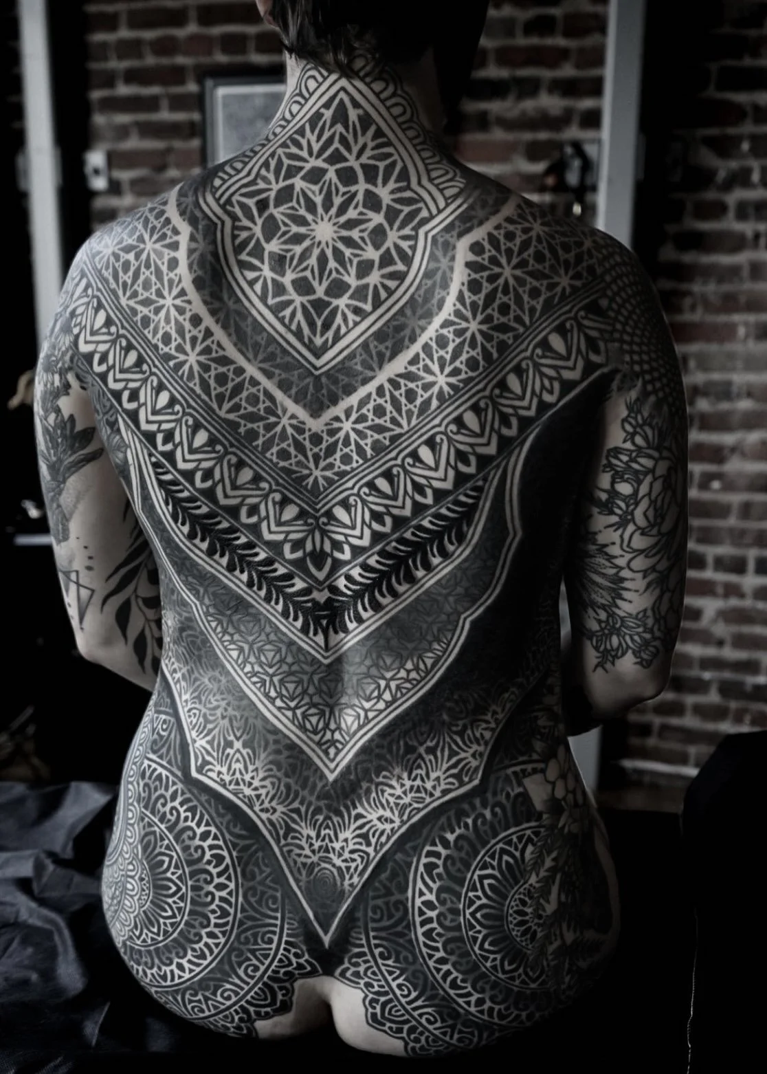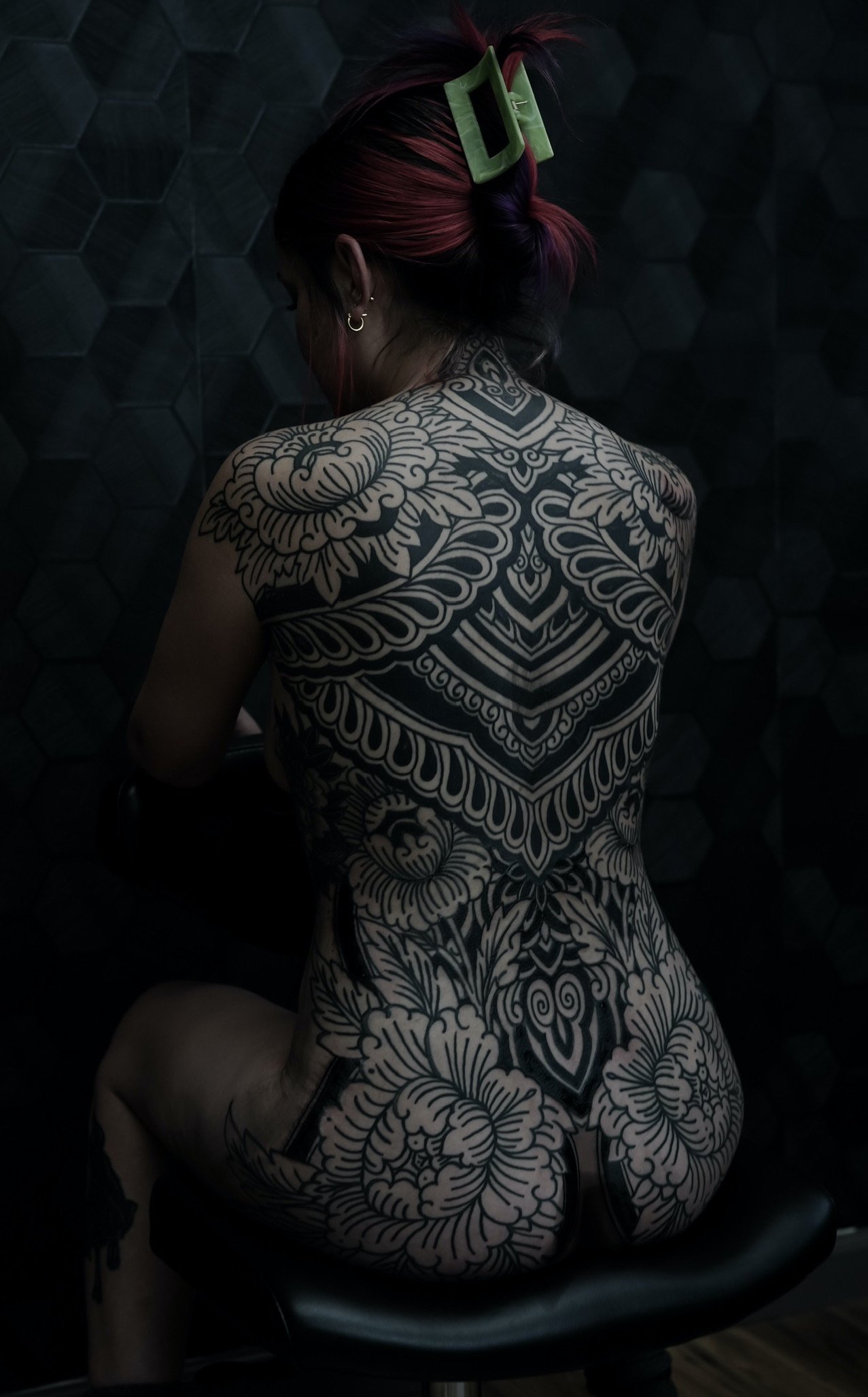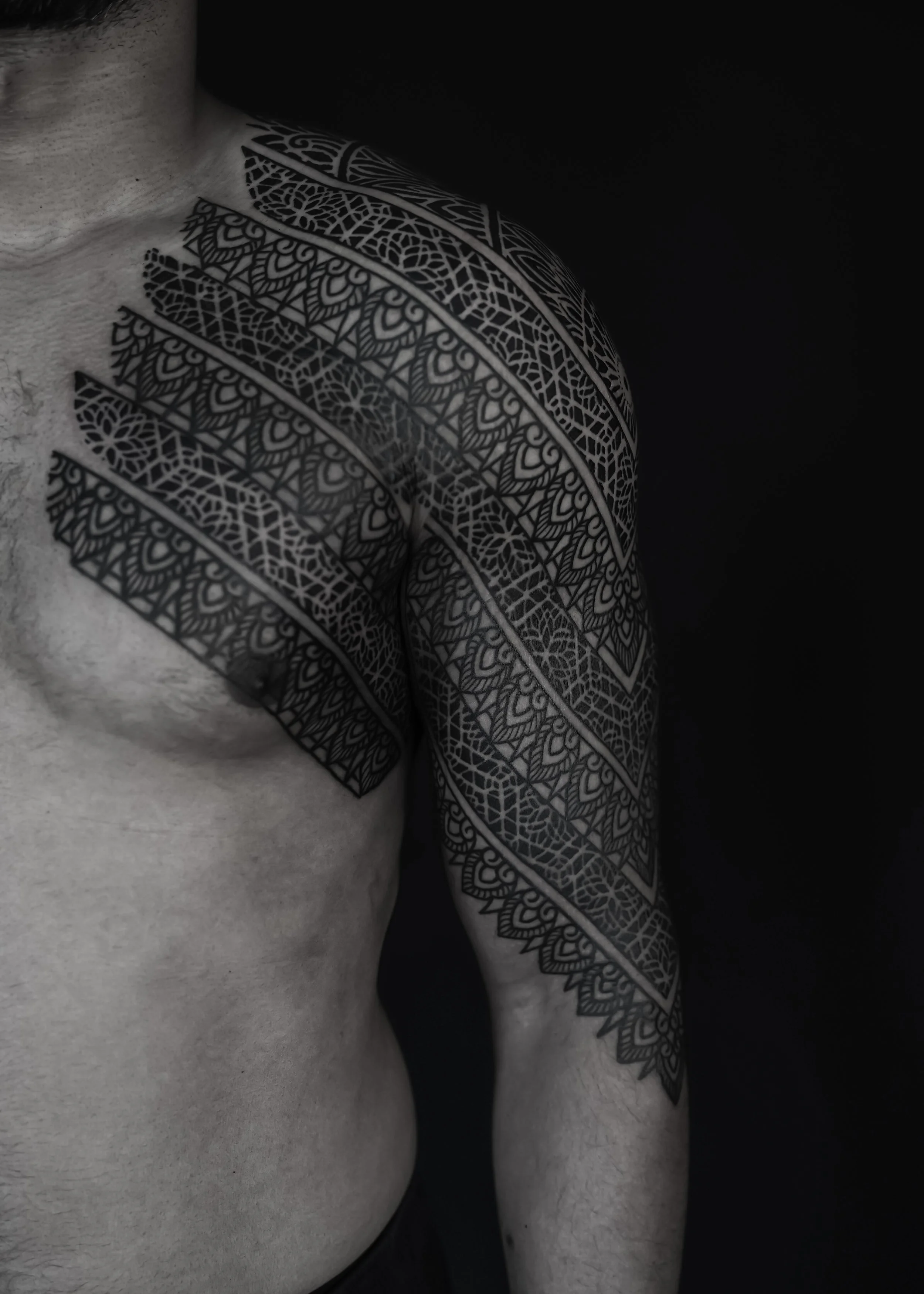 He specializes in dot work, blackwork, shading, and blast-overs, and works closely with clients to create designs that accentuate the natural flow and lines of their bodies.